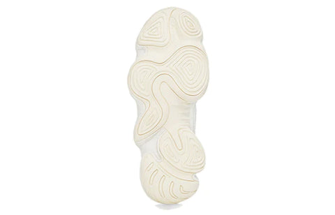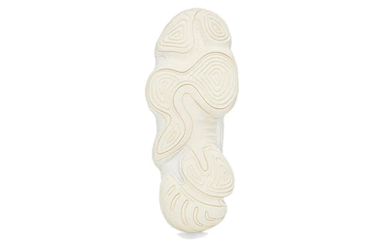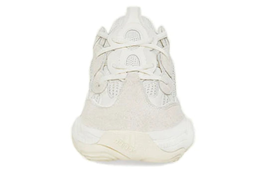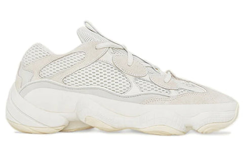 The Adidas Yeezy Boost 500 'Bone White' is a chunky, retro-inspired shoe designed by Kanye West. The upper is made of cow suede, premium leather, and mesh, in Off-White tones, with reflective piping details. The midsole is made of Adidas' adiPRENE+ cushioning material, and the outsole features contoured rubber pods for traction.
