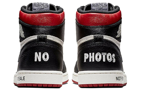 This Air Jordan 1 Retro High OG NRG “Not For Resale” is dressed in a Sail, Black, and Varsity Red colorway. They include ‘No Photos’ embroidered across the heel of the left and right shoe, ‘Wear Me’ across the tongues, and ‘Please Crease’ stamped on each toe box, and “Not For Resale” text on the midsole.